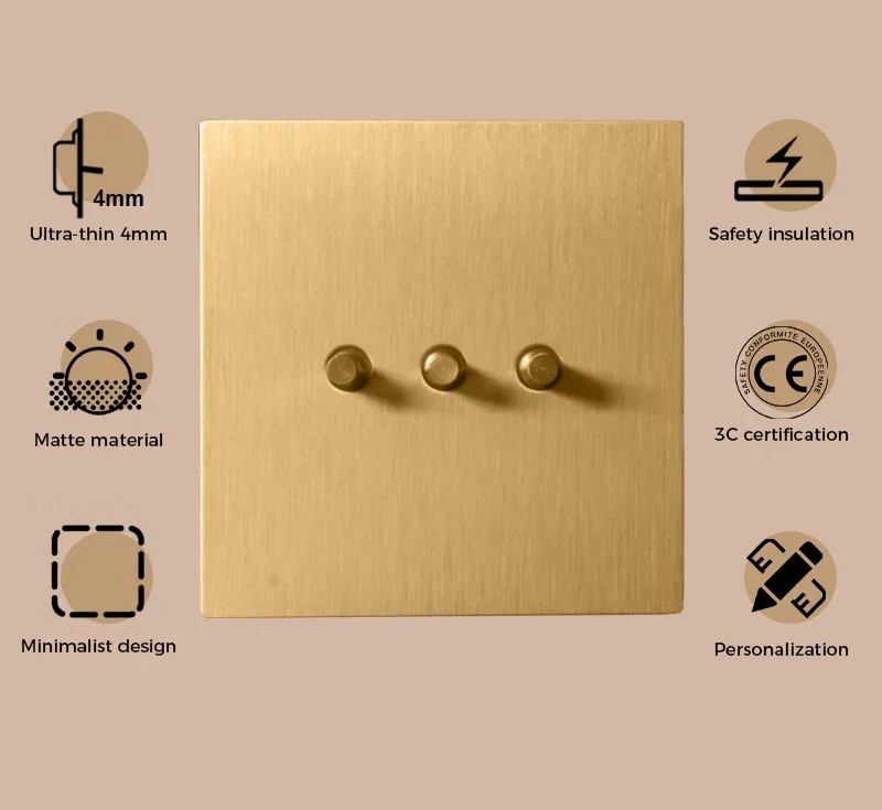 Our Retro Light Switch Gold Copper Panel combines luxurious design, durability, and modern functionality, making it a standout choice for stylish interiors. Crafted from premium copper, its elegant gold finish enhances any space with a warm, sophisticated touch while ensuring resistance to wear and tarnishing. The retro-style toggle lever brings a vintage charm while offering smooth, precise operation. Plus, its ultra-thin panel design ensures a seamless, flush fit.